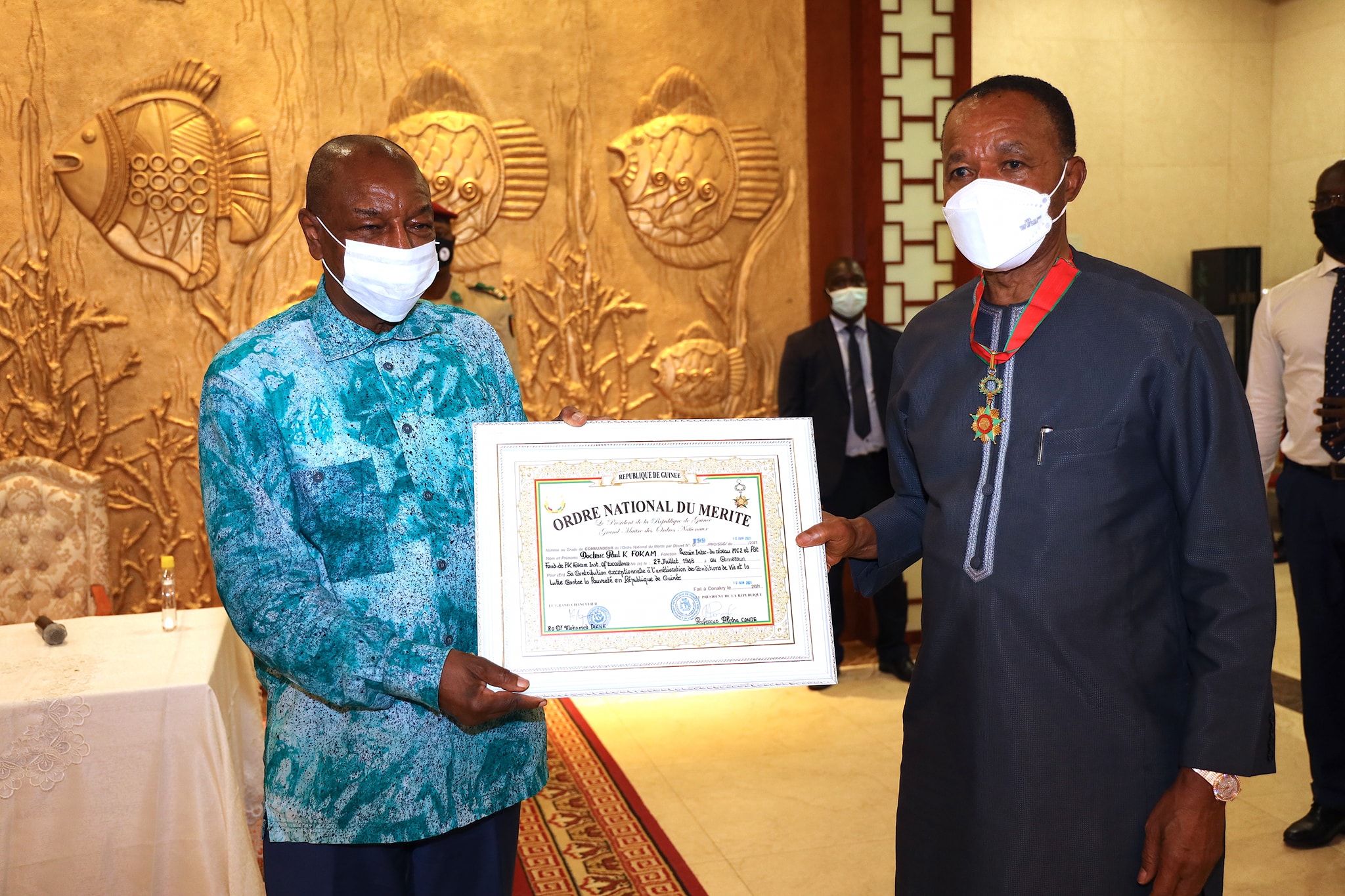 « Pour sa contribution exceptionnelle à la lutte contre la pauvreté en Guinée, j’ai décoré du grade de Commandeur de l’Ordre national du mérite, Dr Paul K. Fokam, parrain international du réseau MC2 et fondateur de PkFokam Institute of Excellence », a posté sur son compte Facebook le président guinée, Alpha Condé. C’était le 11 juin 2021.