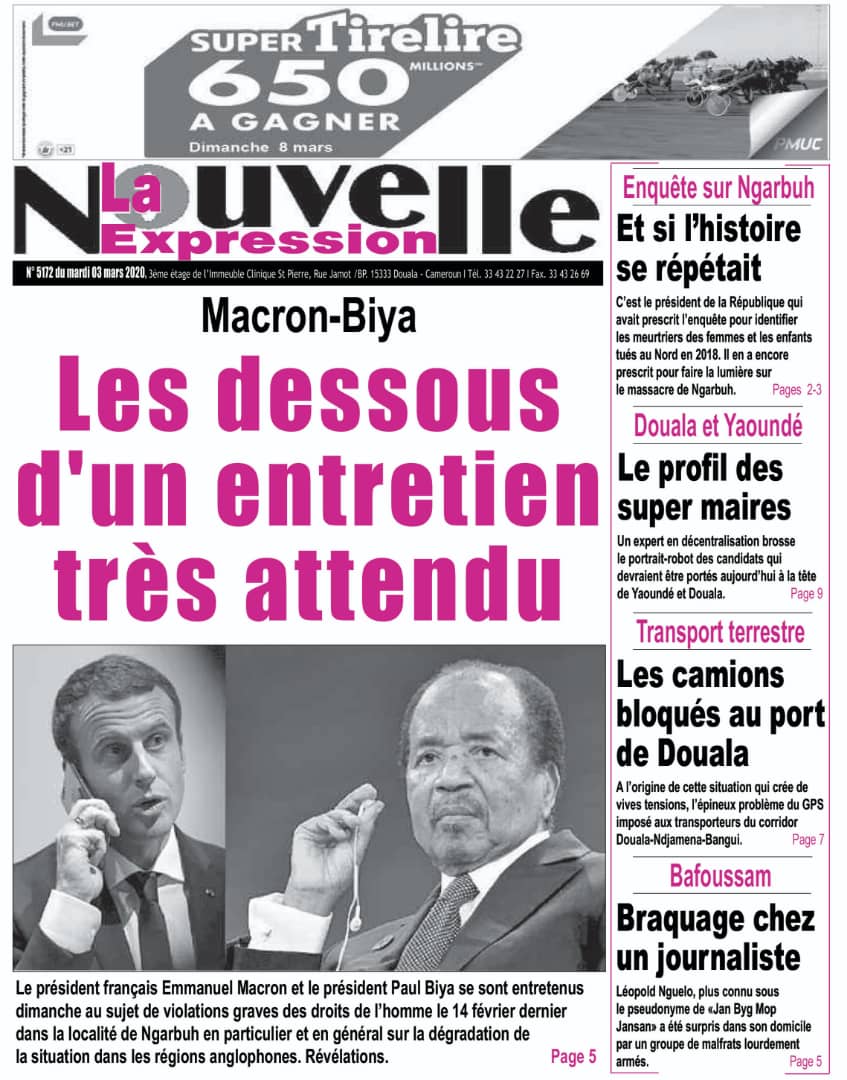Macron-Biya : « Les dessous d’un entretien très attendu ». Le président français Emmanuel Macron et le président Paul Biya se sont entretenus dimanche au sujet de violations graves des droits de l’homme le 14 février dernier dans la localité de Ngarbuh en particulier et en général sur la dégradation de la situation dans les régions anglophones. (La Nouvelle Expression)