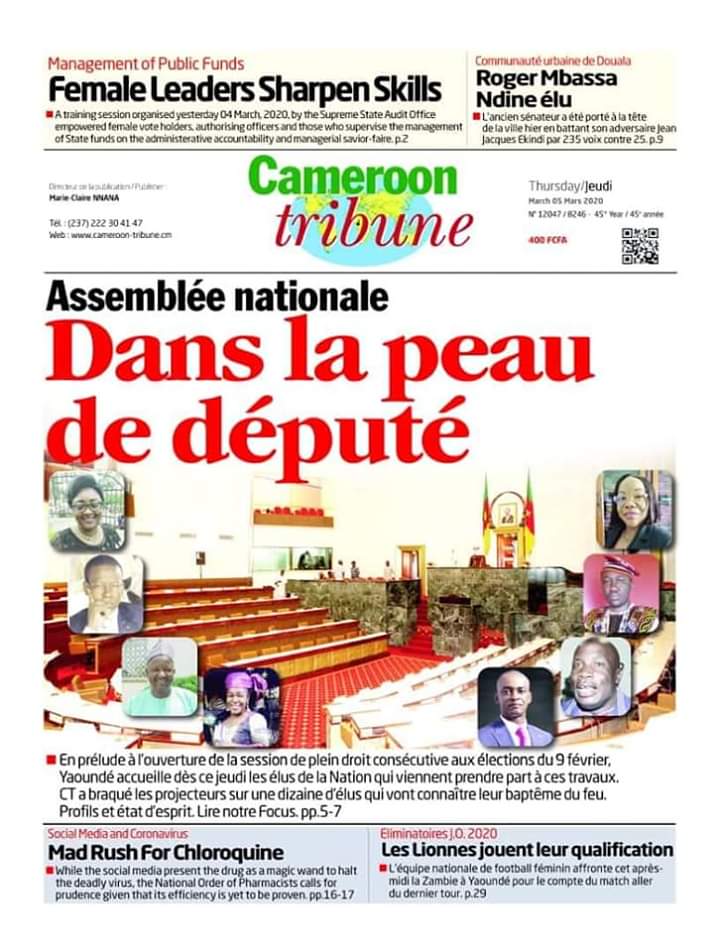 Assemblée nationale : « Dans la peau de député ». En prélude à l’ouverture de la session de plein droit consécutive aux élections du 9 février, Yaoundé accueille dès ce jeudi les élus de la Nation qui viennent prendre part à ces travaux. CT a braqué les projecteurs sur une dizaine d’élus qui vont connaître leur baptême du feu. (Cameroon Tribune)